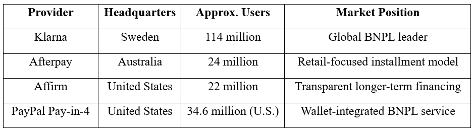 The expansion of the BNPL ecosystem has been driven primarily by fintech firms embedding installment lending into online retail platforms. Leading providers include Klarna, Afterpay, Affirm, and PayPal.