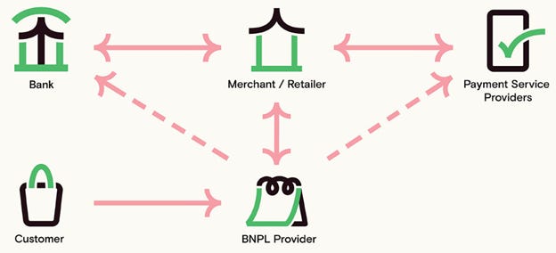 In this ecosystem, the BNPL provider acts as the intermediary lender that pays the merchant at the point of purchase while collecting installment repayments from the customer over time. The merchant benefits from immediate payment confirmation and reduced checkout friction, while consumers gain access to short-term financing embedded directly within the purchasing process.